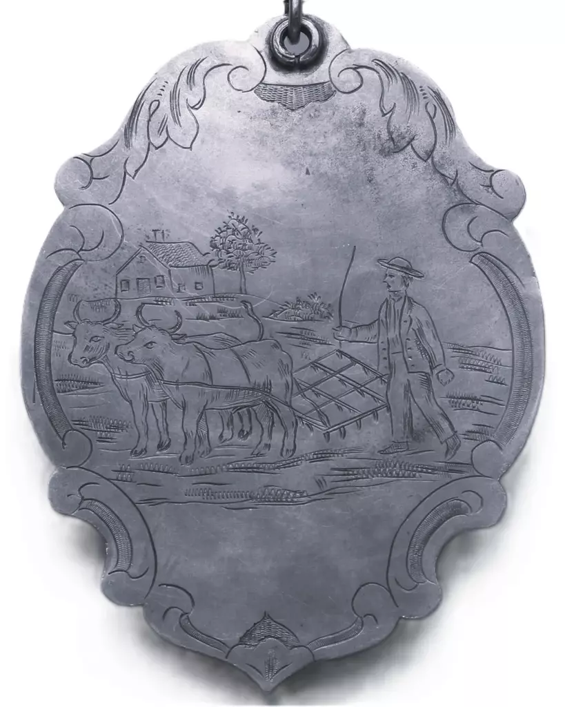 Mit zwei Ochsen eggender Bauer