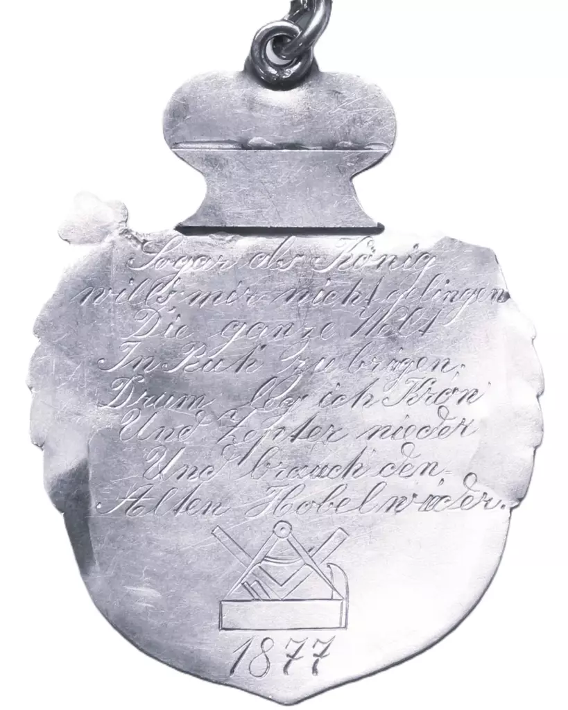 „Sogar als König will ́s mir nicht gelingen Die ganze Welt In Ruh zu bringen – Drum leg ich Kron‘ Und Zepter nieder Und brauch den Alten Hobel wieder. 1877“