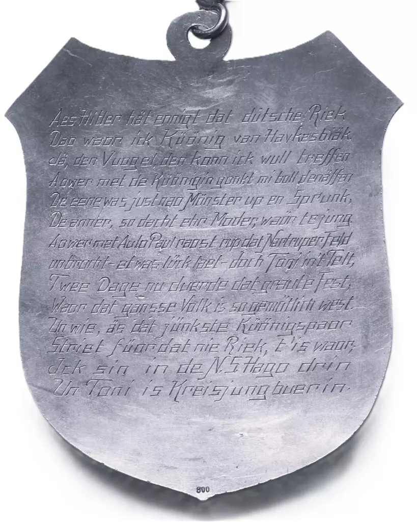 Aes Hitler hät ennigt dat dütsche Riek Dao woar ick Küönig van Havkesbiäk dä, den Vogel, den kann ick wull treffen Aower met de Küönigin gankt mi ball denäffen De eene was just nao Mönster up en Sprunk, De anner, so dacht ehr Moder, waör te jung. – Aower met Auto Paul raost rup dat Natruper Feld un bracht – es was lück laet – doch Toni in’t Telt, Twee Dade nu duerde dat graute Fest, Waor dat gansse Volk is so gemötlich west. Un wie, äs dat jünkste Küönigspaor Striet füor dat nie Riek, t’is waor; Ick sin in de N.S. Hago drin – Un Toni is Kreisjungbuerin.