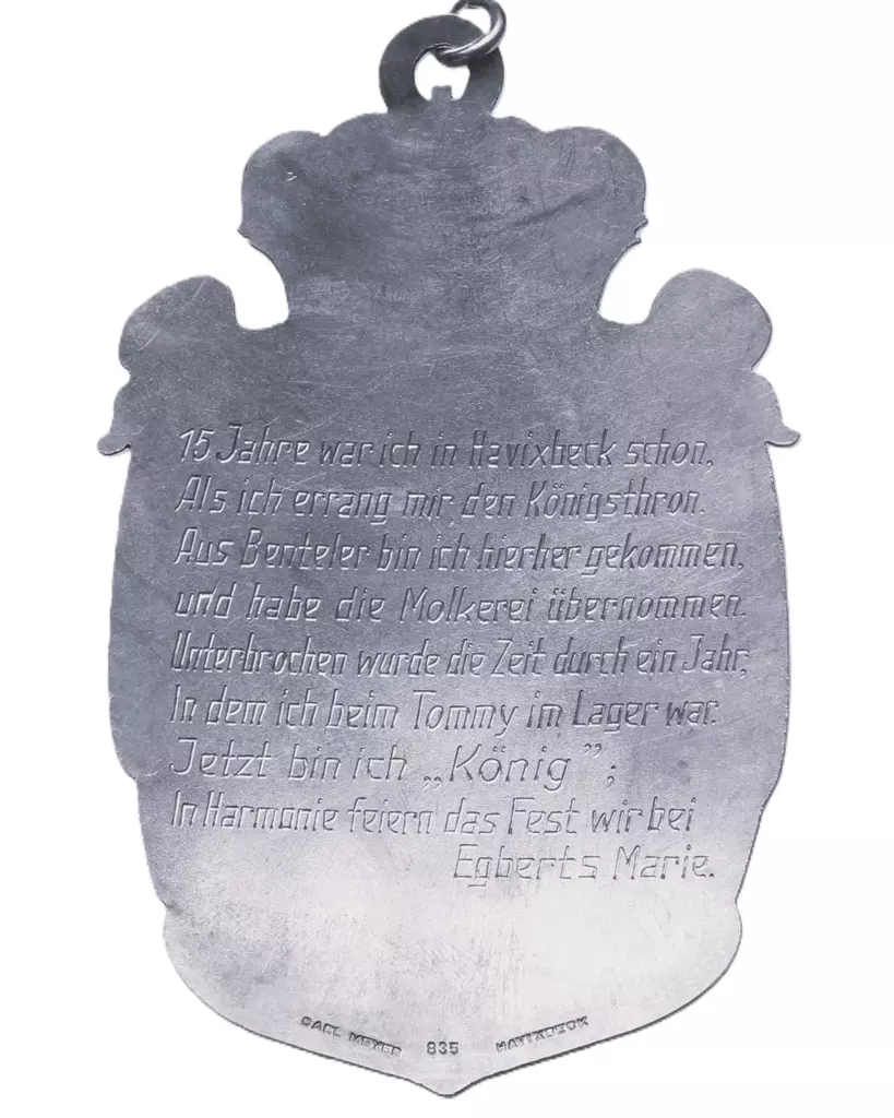 15 Jahre war ich in Havixbeck schon, Als ich errang mir den Köhnigsthron. Aus Benteler bin ich hierher gekommen, und habe die Molkerei übernommen. Unterbrochen wurde die Zeit durch ein Jahr, in dem ich beim Tommy im Lager war. Jetzt bin ich „König“; In Harmonie feiern das Fest wir bei Egberts Marie.