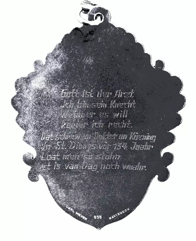 Gott ist der Arzt Ich bin sein Knecht Wenn er es will kurier ich recht. Dat schrew en Dokter un Küening In St. Dionys vör 134 Joahr – loat men so stohn et is van Dag noch woahr.