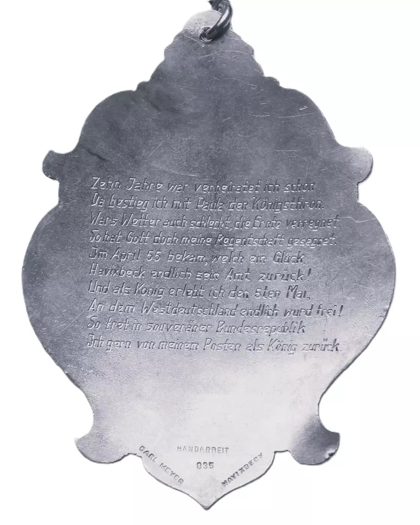 Zehn Jahr war verheiratet ich schon Da bestieg ich mit Paula den Königsthron. Wars Wetter auch schlecht, die Ernte verregnet. So hat Gott doch meine Regentschaft gesegnet. Im April 55 bekam, welch ein Glück Havixbeck endlich sein Amt zurück! Und als König erlebt ich den 5ten Mai, an dem Westdeutschland endlich wurd frei! So tret in souveräner Bundesrepublik ich gern von meine Posten als König zurück