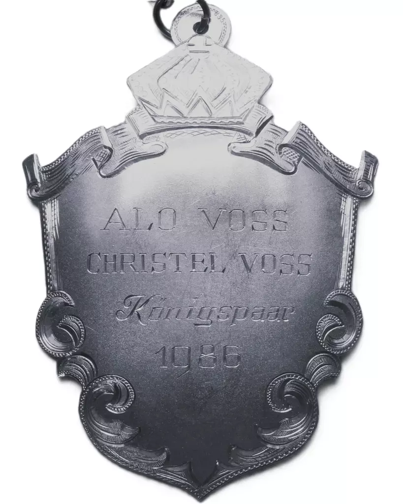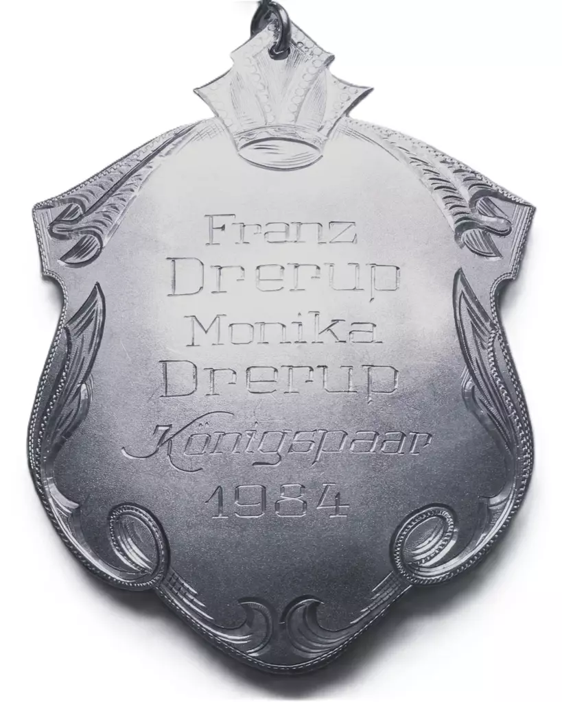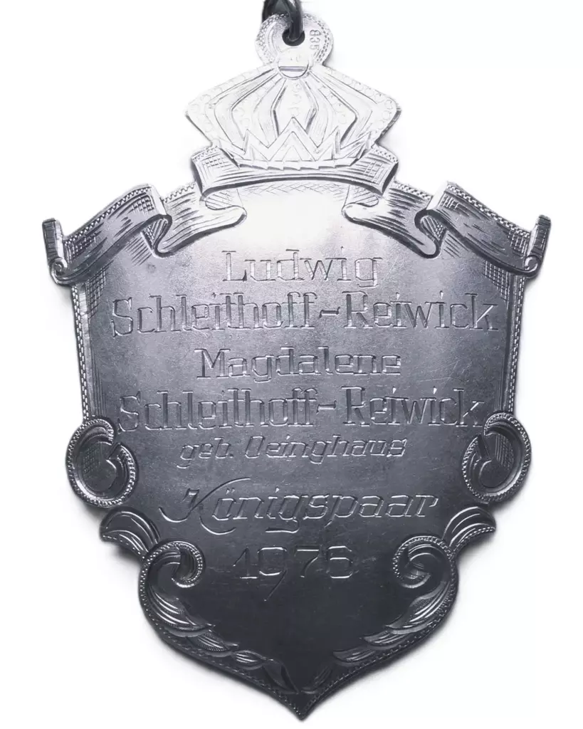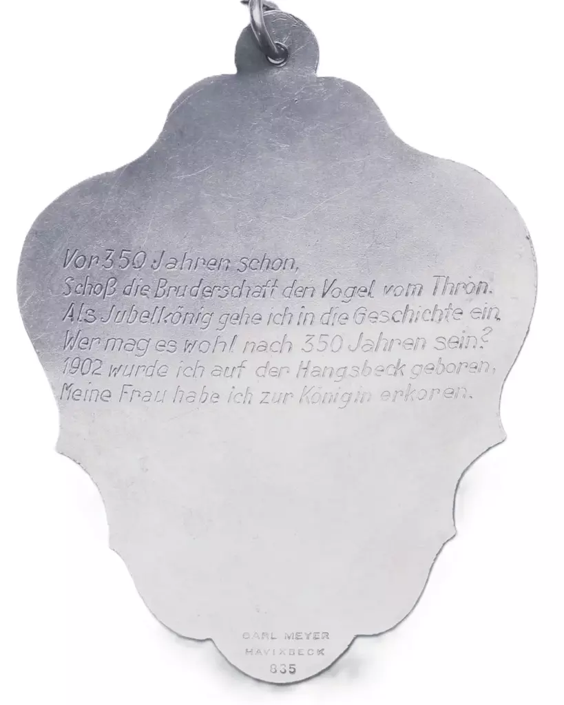 Vor 350 Jahren schon, Schoß die Bruderschaft den Vogel vom Thron. Als Jobelkönig gehe ich in die Geschichte ein. Wer mag es wohl nach 350 Jahren sein? 1902 wurde ich auf der Hangsbeck geboren, Meine Frau habe ich zur Königin erkoren.