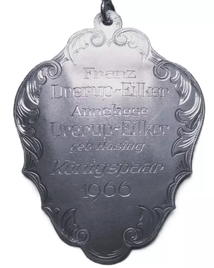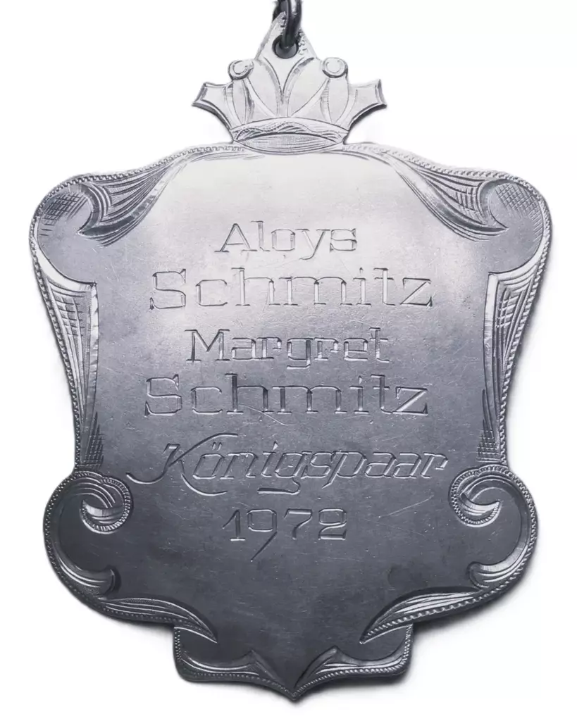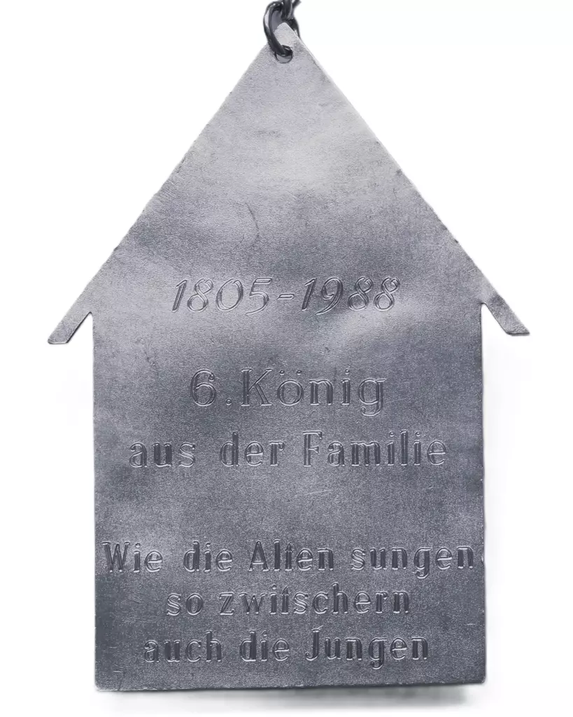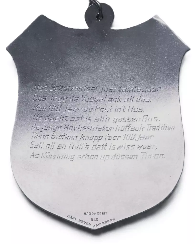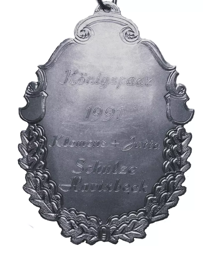 Vor 350 Jahren schon, Schoß die Bruderschaft den Vogel vom Thron. Als Jobelkönig gehe ich in die Geschichte ein. Wer mag es wohl nach 350 Jahren sein? 1902 wurde ich auf der Hangsbeck geboren, Meine Frau habe ich zur Königin erkoren.