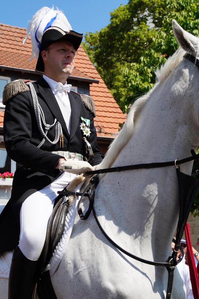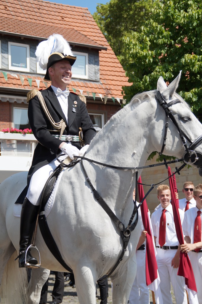 Nach der Kranzniederlegung am Ehrenmal, leitet er den Marsch zur Vogelwiese zum Königsschießen an.