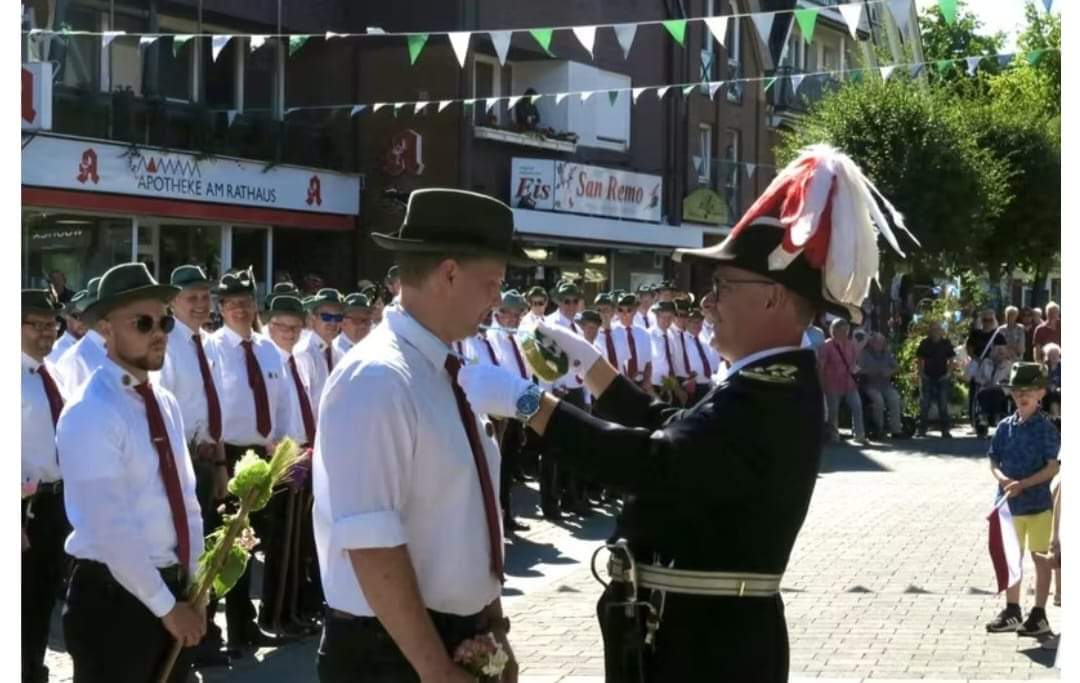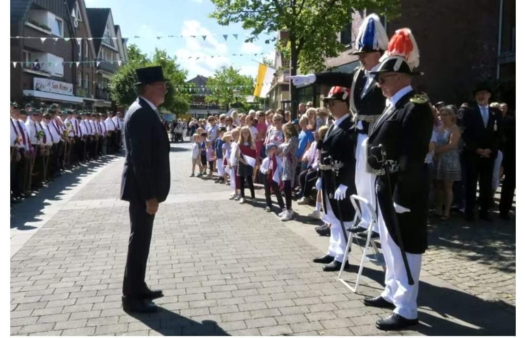 Nach der Kranzniederlegung am Ehrenmal, leitet er den Marsch zur Vogelwiese zum Königsschießen an.